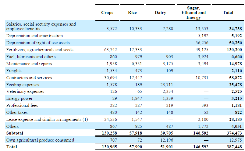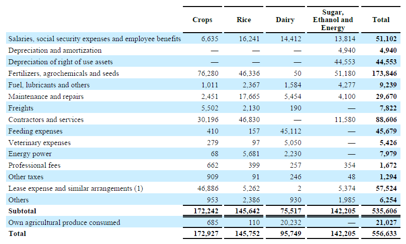 Biological assets comprise growing crops (mainly corn, wheat, soybeans, sunflower peanuts and rice), sugarcane and livestock (growing herd and cattle for dairy production).