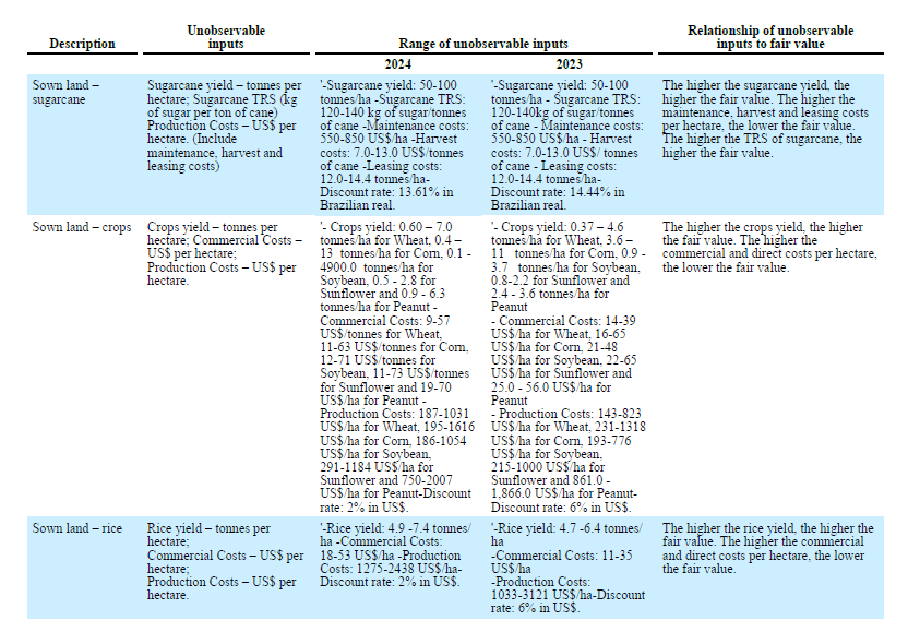 As of December 31, 2024, the impact of a reasonable 10% increase / (decrease) in estimated costs, with all other variables held constant, would result in a decrease (increase) in the fair value of the Group’s biological asset less cost to sell of US$23.3 million for sugarcane, US$3.4 million for crops and US$6.5 million for rice.