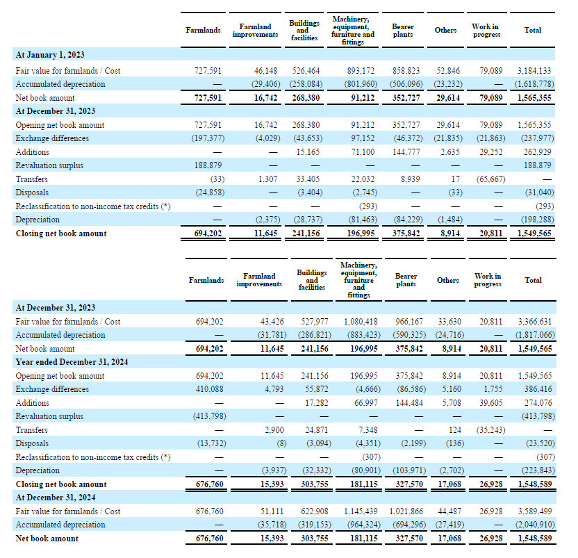 The assets’ residual values and useful lives are reviewed, and adjusted if appropriate, at each statement of financial position date. Farmlands are measured at fair value using a sales comparison approach. prepared by an independent expert. Sale prices of comparable properties are adjusted considering the specific aspects of each property, the most relevant assumption being the price per hectare (Level 3). The Group estimated that, other factors being constant, a 10% reduction on the sales price for the year ended December 31, 2024 would have reduced the value of the farmlands on US$67.7 million (2023: US$69.4 million), which would impact, net of its tax effect on the “Revaluation surplus” item in the statement of Changes in Shareholders’ Equity. Should farmlands be carried at historical cost, the net book value as of December 31, 2024 would have been US$312.6 million.