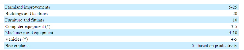 Depreciation is calculated using the straight-line method to allocate their cost over the estimated useful lives. Farmlands are not depreciated, except for bearer plants.