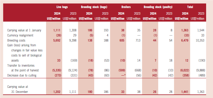 The Group engaged an independent qualified valuer to perform the live hog valuations at the end of each reporting period, the fair values less costs to sell are determined based on the price of hogs in the actively traded market, reduced by the breeding costs required to raise the hogs to be slaughtered and the margins that would be required by a raiser and less costs to sell, with reference to the latest budgets approved by management. This determination involved the use of significant judgements and estimates. If the actual results differ to the original estimates made by management, such differences from the original estimates will impact the fair value change recognised in profit or loss. The carrying amount of live hogs was US$1,202 million as at 31 December 2024 (2023: US$1,111 million) (see note 17).