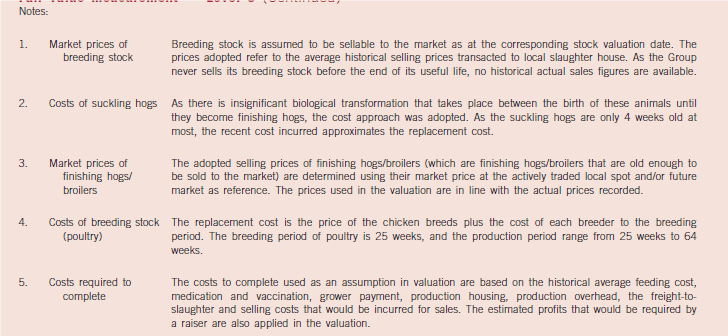 Changes in fair value less costs to sell of biological assets include changes in the fair value of the hogs and poultry at the end of both years. The Group’s biological assets were valued by the independent qualified valuer, Jones Lang LaSalle Corporate Appraisal and Advisory Limited (“JLL”) situated at 7/F, One Taikoo Place, 979 King’s Road, Hong Kong.