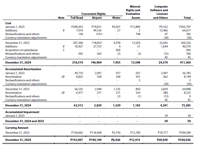 The combined carrying amounts of toll road, airport and water concession rights amounted to P305,582 and P272,812 as at December 31, 2024 and 2023, respectively (Note 17).