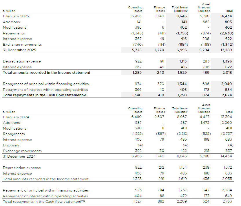 The Group is exposed to future cash outflows (on an undiscounted basis) at 31 December 2025, for which no amount has been recognised, for potential extension options of €1,068 million (2024: €1,115 million) due to it not being reasonably certain that these leases will be extended.
