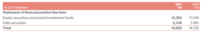 Included in equity securities and pooled investment funds as at 31 December 2021 were £4,610m (2020: £4,934m) of investments in structured entities managed by the Group. Investment management fees for the year ended 31 December 2021 of £444m (2020: £475m) were recognised from managing these entities.