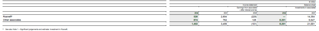 The following table provides aggregated summarized financial information for the group’s associates as it relates to the amounts recognized in the group income statement and on the group balance sheet. There were no individually material associates to the Group at 31 December 2022. The associate which was material to the Group at both 31 December 2021 and 2020 was Rosneft. At 31 December 2021 and 2020 bp classified its investment in Rosneft as an associate because, in management’s judgement, bp had significant influence over Rosneft. On 27 February 2022, bp announced it would exit its shareholding in Rosneft and bp’s two nominated Rosneft directors both stepped down from Rosneft’s board. As a result, the significant judgement on significant influence over Rosneft was reassessed and a new significant estimate was identified for the fair value of bp’s equity investment in Rosneft. From that date, bp accounts for its interest in Rosneft as a financial asset measured at fair value within ‘Other investments’. The total pre-tax charge during the year-ended 31 December 2022 relating to bp’s investment in Rosneft is $24,561 million consisting of $11,082 million included in losses on disposal, primarily relating to the recycling to the income statement of accumulated exchange losses, and a $13,479 million impairment charge including $528 million which relates to estimated earnings in the first two months of the year prior to the loss of significant influence. For further information see Note 1 – Investment in Rosneft and Note 4 Disposals and impairment. As a result of bp’s decision to exit its other businesses with Rosneft in Russia, which were primarily accounted for as investments in associates, an additional impairment charge of $1,043 million including $35 million which relates to estimated earnings in the first two months of the year and accumulated exchange losses of $479 million previously charged to equity have been taken to the income statement. The total pre-tax charge in 2022 relating to bp’s investment in Rosneft and other businesses with Rosneft in Russia is $25,520 million.