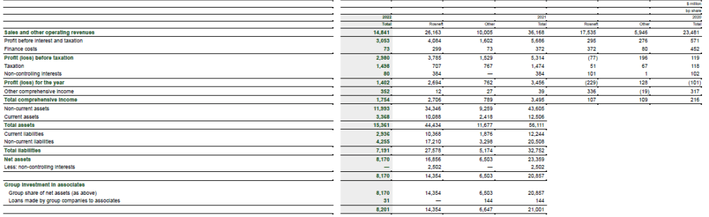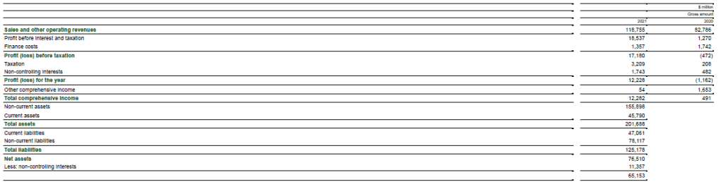 The following table provides summarized financial information relating to Rosneft for 2021 and 2020. This information is presented on a 100% basis and reflects adjustments made by bp to Rosneft’s own results in applying the equity method of accounting. bp adjusted Rosneft’s results for the accounting required under IFRS relating to bp’s purchase of its interest in Rosneft and the amortization of the deferred gain relating to the disposal of bp’s interest in TNK-BP.