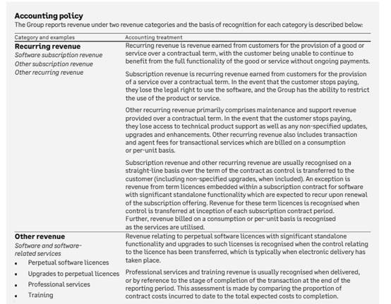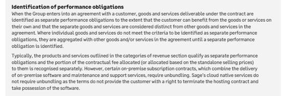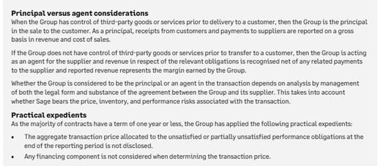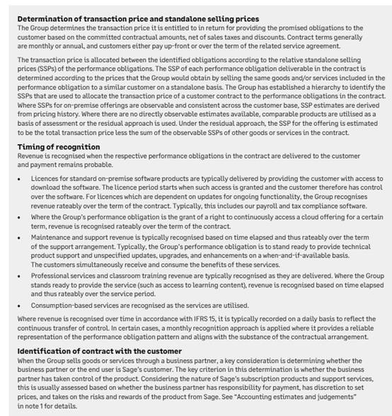 Over a third of the Company’s revenue is generated from sales to business partners rather than end users. The key judgement is determining whether the business partner is a customer of the Group. The key criterion in this determination is whether the business partner has taken control of the product. Considering the nature of Sage’s subscription products and support services, this is usually assessed based on whether the business partner has responsibility for payment, has discretion to set prices, and takes on the risks and rewards of the product from Sage.