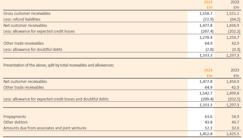 The fair value of customer receivables and other trade receivables is approximately £1,310m (2023: £1,260m). This has been calculated based on future cash flows discounted at an appropriate rate for the risk of the debt. The fair value is within Level 3 of the fair value hierarchy (refer to the Fair Value Hierarchy table in Note 28).