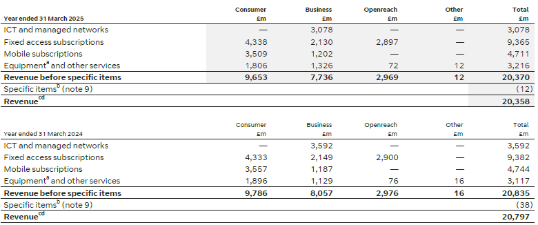 d We have further disaggregated the revenue presented here to derive the UK adjusted service revenue of £15,582m (FY24: £15,727m). Please refer to our adjusted UK service revenue reconciliation in the Additional Information section of this report for details. Adjusted UK service revenue includes some portion of equipment revenue where that equipment is sold as part of a managed services contract, or where that equipment cannot be practicably separated from the underlying service.