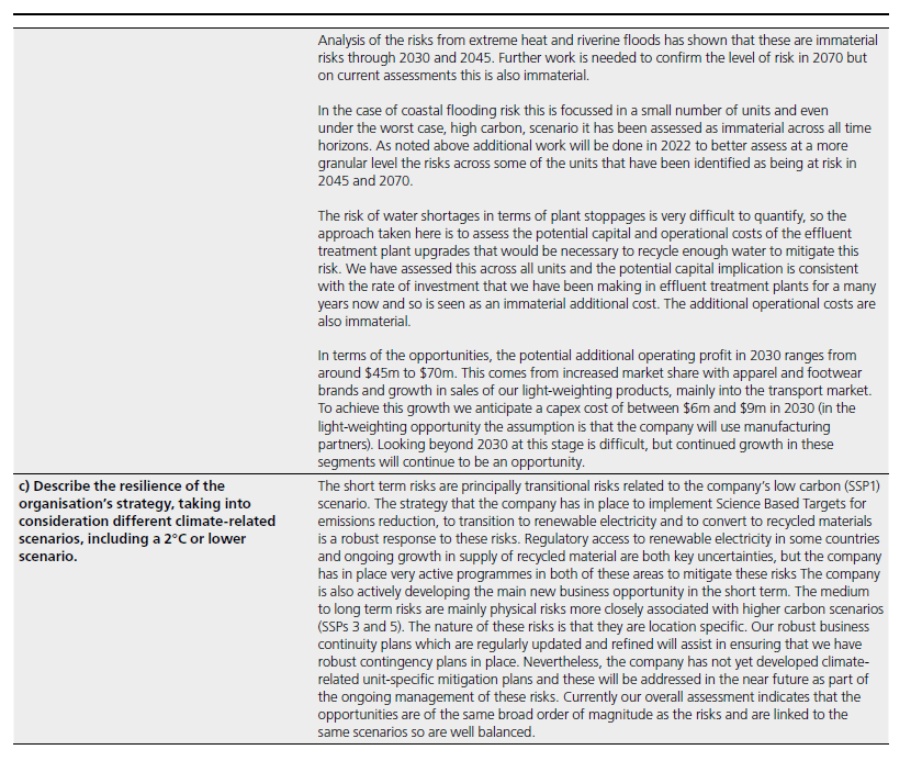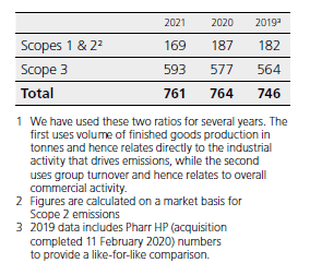 In 2021 our absolute emissions for all three Scopes increased from the 2020 level as our industrial activity increased subsequent to pandemic disruptions in 2020. Our Scopes 1 and 2 absolute emissions were 7% below our 2019 baseline notwithstanding a 5% increase in production. Our Scopes 1 and 2 relative emissions (emissions intensity in kilos CO2e/ kilo of production and tonnes CO2e/$million of sales) reduced by 12% and 7% respectively against out 2019 baseline and 7% and 10% against 2020. These reductions have largely been achieved by energy saving activities as there has not been a significant transition yet to renewable energy sources. Scope 3 absolute and relative emissions increased mainly due to logistics challenges during 2021 leading to higher transport emissions and an increase in the upstream energy conversion factors. We expect to see the shift to recycled raw materials and the switch to renewable energy sources having an increasing impact on Scope 3 emissions in the near future.