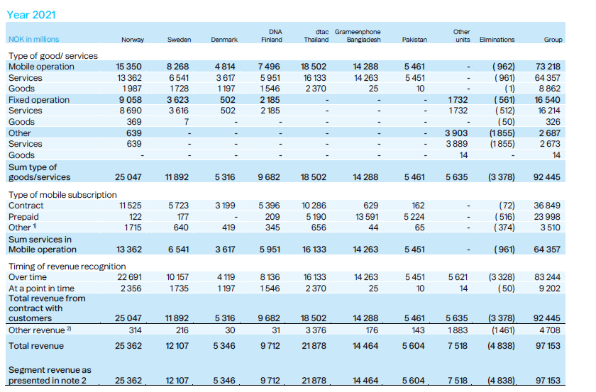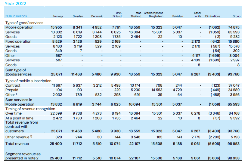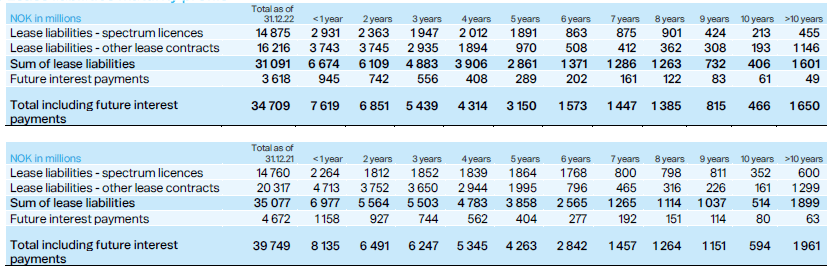 Repayments of the principal portion related to total lease liabilities in 2022 of NOK 8.1 billion (NOK 8.8 billion in 2021) include instalment payment of spectrum licences of NOK 2.5 billion (NOK 2.9 billion in 2021) and repayments of other leases of NOK 5.6 billion (NOK 6.0 billion in 2021). The instalment payments of spectrum licences in 2022 and 2021 were mainly in dtac, Norway and Pakistan. Lease payments related to other lease contracts were mainly in dtac, Sweden, Digi, Pakistan and Grameenphone in 2022 whereas in 2021 it was mainly in dtac, Sweden, Digi, Myanmar, Pakistan.