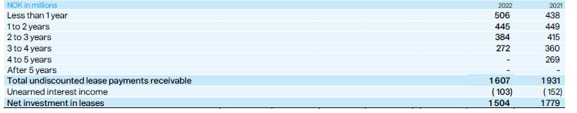 During 2022, the Group recognised interest income of NOK 60 million (NOK 73 million in 2021) (note 9) related to finance lease receivables.