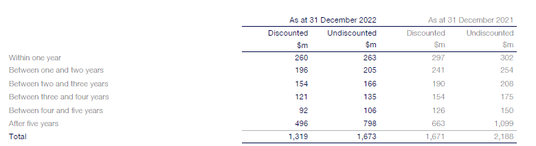 The table below shows a maturity analysis of the discounted and undiscounted lease liability arising from the Group’s leasing activities. The projections are based on the foreign exchange rates applying at the end of the relevant financial year and on interest rates (discounted projections only) applicable to the lease portfolio.