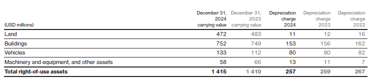 The following table shows the right-of-use assets carrying value at December 31, 2024 and 2023, and the continuing operations depreciation charge for years 2024, 2023 and 2022, by underlying class of asset1: