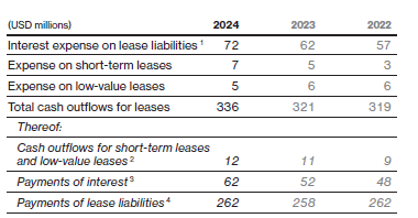 1 The weighted average interest rate is 4.0% (2023: 3.5%, 2022: 3.3%). Interest on lease liabilities as at December 31, 2024, is estimated to be USD 56 million for 2025 and USD 1.3 billion thereafter.