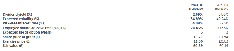 The Group operates savings-related share option schemes where options are granted at a discount of between 20% and 25% of the market price at the date of invitation over a three year savings contract. Options are exercisable during the six month period following completion of the savings contract. The charge recognised in the Group Income Statement in respect of these options was £0.9m (2023: £1.1m). Grant date fair value was arrived at by applying a trinomial model, which is a lattice option-pricing model.