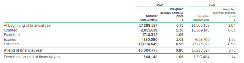 In June 2023, 2,506,236 shares were awarded when the share price was £0.80, and a further 117,537 shares were awarded in September 2023 when the share price was £0.77.