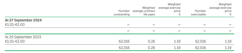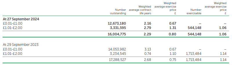 During the financial year ended 27 September 2024, ShareSave Scheme options were granted 2,851,819 shares in the UK only, which will ordinarily be exercisable at an exercise price of £1.36 per share, during the period 1 September 2027 to 28 February 2028. The weighted average fair value of options granted during the financial year ended 27 September 2024 was £0.29.