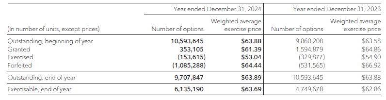 We did not grant performance-based options in 2024 (2023 – nil). Certain performance options granted in prior years have certain non-market vesting conditions related to the Shaw Transaction, including the achievement of certain preset integration-related milestones by the second anniversary of closing the Shaw Transaction. As at December 31, 2024, we had 2,583,435 performance options (2023 – 2,740,952) outstanding. The outstanding options that were granted prior to 2022 vest on a graded basis over four years provided certain targeted stock prices are met on or after each anniversary date.