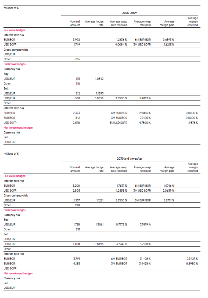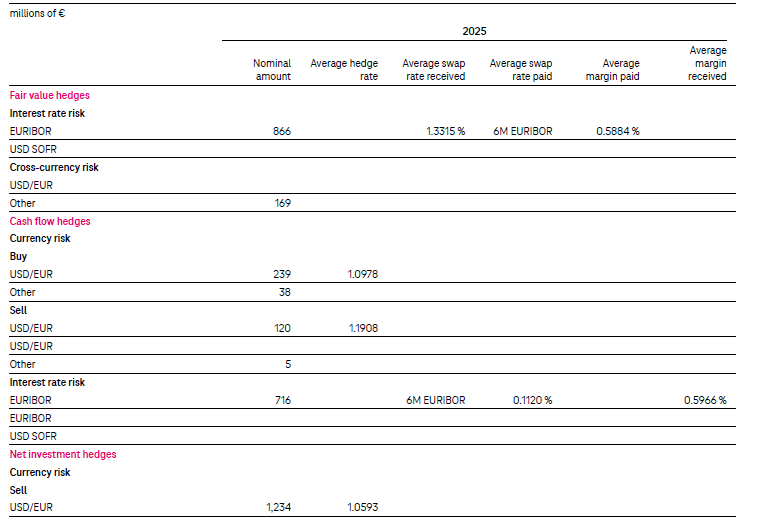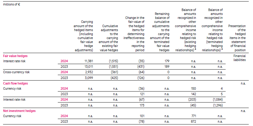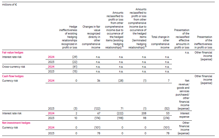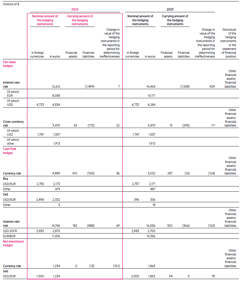 Hedging of a net investment. To hedge the net investment in T‑Mobile US against fluctuations in the U.S. dollar spot rate, a net investment hedge of a nominal USD 1.3 billion was designated in the reporting period. Short-term currency forwards are used as hedging instruments (“pay U.S. dollars – receive euros”) with a change in the U.S. dollar spot rate being designated as the hedged risk. Any changes in value of the hedged net investment resulting from changes in the U.S. dollar spot exchange rate are offset by changes in the value of the currency forwards. At each reporting date, effectiveness is reviewed prospectively based on the key characteristics and is determined retrospectively in the form of a dollar offset test. The net investment hedge was sufficiently effective as of the reporting date. The hedges of the net investment in T‑Mobile US against fluctuations in the U.S. dollar spot rate de-designated in prior periods did not generate any effects in 2024. The amounts recognized under cumulative other comprehensive income would be reclassified to profit or loss in the event of the disposal of T‑Mobile US.