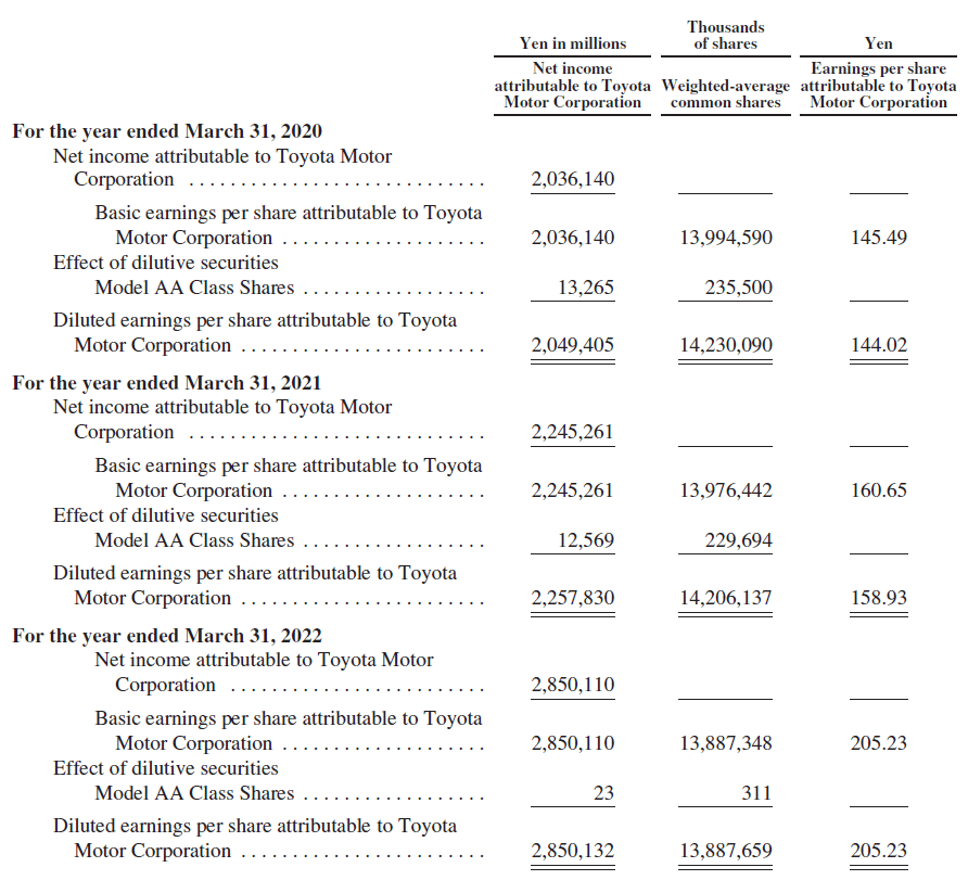 On October 1, 2021, TMC effected a five-for-one stock split of its common stock to shareholders. “Basic earnings per share attributable to Toyota Motor Corporation”, “Diluted earnings per share attributable to Toyota Motor Corporation” and “Toyota Motor Corporation shareholders’ equity per share” are calculated based on the assumption that the stock split was implemented at the beginning of the earliest period presented in this note.