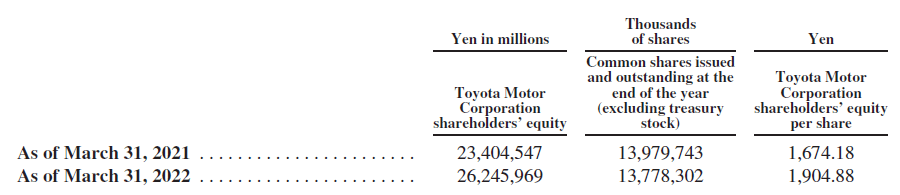 The following table shows Toyota Motor Corporation shareholders’ equity per share. Toyota Motor Corporation shareholders’ equity per share amounts are calculated by dividing Toyota Motor Corporation shareholders’ equity in the consolidated statement of financial position by common shares issued and outstanding at the end of the year (excluding treasury stock).