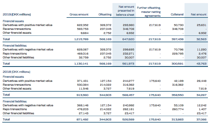 Assets and liabilities are offset when the Group and the counterparty have a legally enforceable right to offset recognised amounts and have agreed to settle the balances on a net basis or to realise the asset and settle the liability simultaneously. Positive and negative fair values of derivatives with the same counterparty are offset if the Group has agreed with the counterparty to settle contractual cash flows net and to make cash payments or provide collateral on a daily basis to cover changes in the fair value of the derivative position. Master netting agreements or similar agreements give the right to additional offsetting in the event of default. Such agreements reduce the exposure further in the event of default, but do not qualify for offsetting in accordance with IFRS.