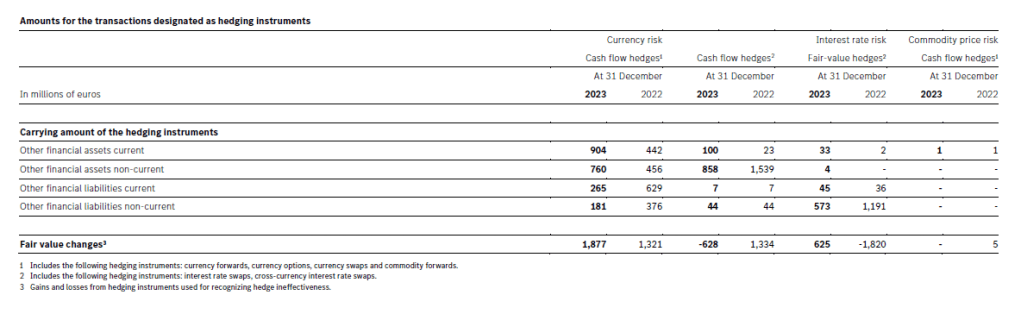 The Mercedes-Benz Group uses cash flow hedges for hedging currency risks, interest rate risks and commodity price risks. The amounts related to items designated as cash flow hedges are shown in the following table. The Group also partially hedges the currency risk of selected investments with the application of derivative or non-derivative financial instruments. Neither in the reporting year nor in the previous year were there any active hedges of net investments in foreign operations.