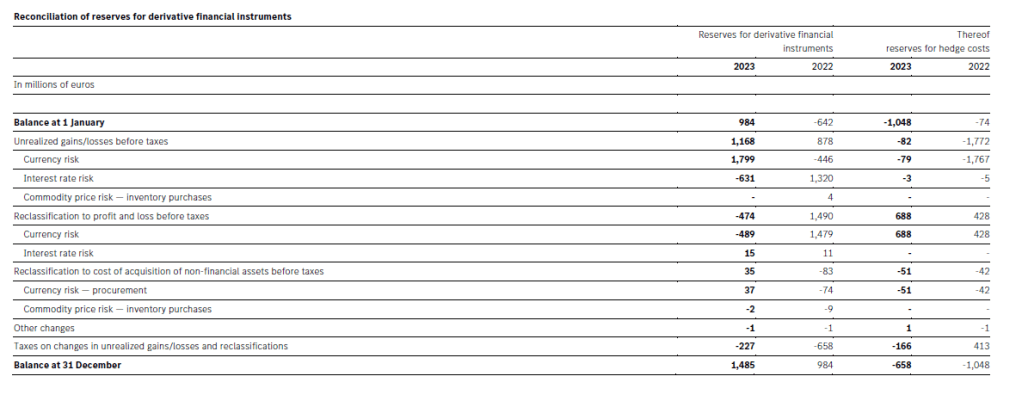 The following table shows the reconciliation of the reserves for derivative financial instruments (excluding reserves for hedges of net investments in foreign operations).