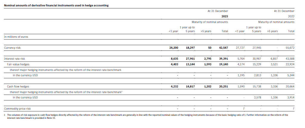 In 2023, the nominal volumes of hedging instruments not designated in a hedging relationship, amounted to €9 billion (2022: €12 billion) for derivatives used to hedge interest rate risks and €13 billion (2022: €15 billion) for derivatives used to hedge exchange-rate risks, as well as €644 million (2022: €644 million) for derivatives used to hedge commodity price risks (energy and raw materials).