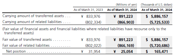 For the transactions, the Company transfers receivables to financial institutions and acquires cash and a subordinate interest in the transferred receivables for financing purposes. The receivables sold are not derecognized because the Company retains a subordinate interest in each transaction and substantially retains all the risks and rewards of ownership of the transferred assets. Cash received from transferring the receivables are included in “Interest-bearing debt” under current liabilities and non-current liabilities as borrowings.