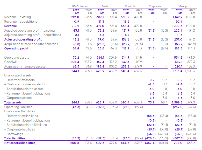 For management reporting purposes, the Group is organised into three main reportable business Sectors: Life Sciences, Seals and Controls. These Sectors are the Group’s operating segments as defined by IFRS 8 and form the basis of the primary reporting format disclosures below. The CODM reviews discrete financial information at this operating segment level. The principal activities of each of these Sectors are described in the Strategic Report on pages 24 to 35. Sector revenue represents revenue from external customers; there is no material inter-Sector revenue. Sector results, assets and liabilities include items directly attributable to a Sector, as well as those that can be allocated on a reasonable basis.