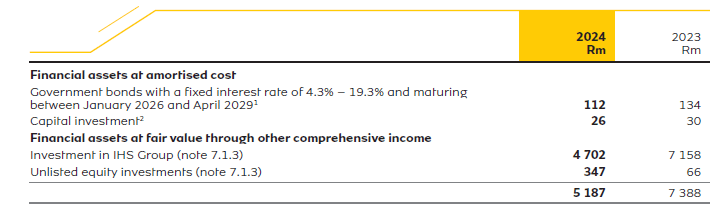 A fair value decrease (translated at average exchange rate) of R2 650 million (2023: R2 689 million) has been recognised for the year. On 13 March 2025, the IHS Group share price was US$3.71, equating to a increase in the fair value of R1 089 million subsequent to 31 December 2024.