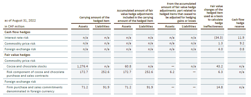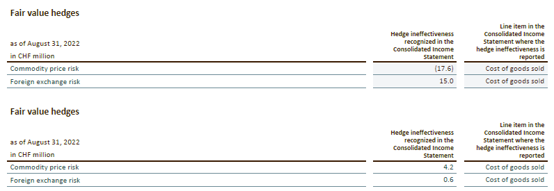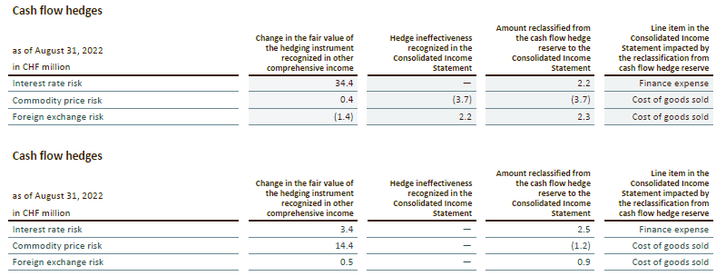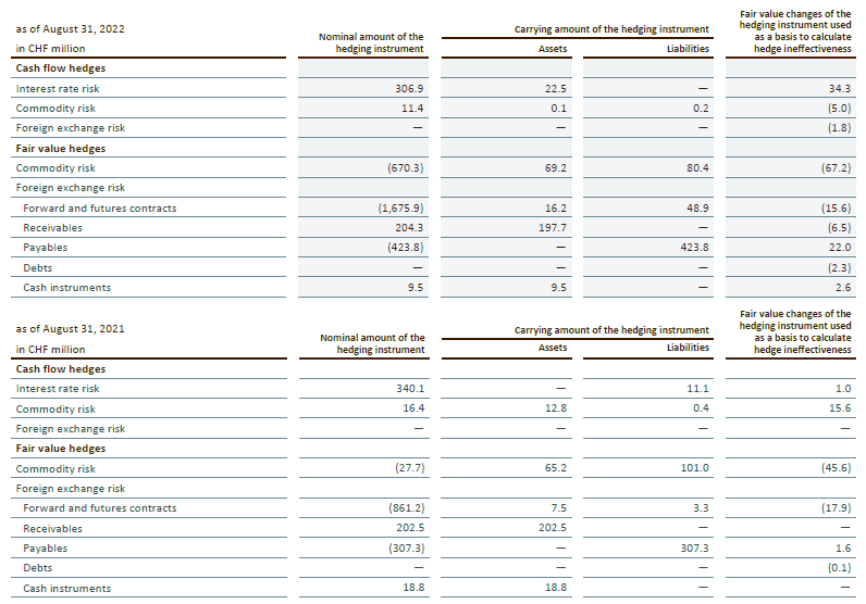 The table in section 3.7.9a “Impact of hedging instruments designated in hedging relationships” (refer to column “Fair value changes of the hedging instrument used as a basis to calculate hedge ineffectiveness”) includes the fair value changes of hedging instruments that are related to hedge accounting relationships, which were still active as at August 31, 2022.