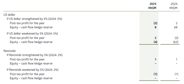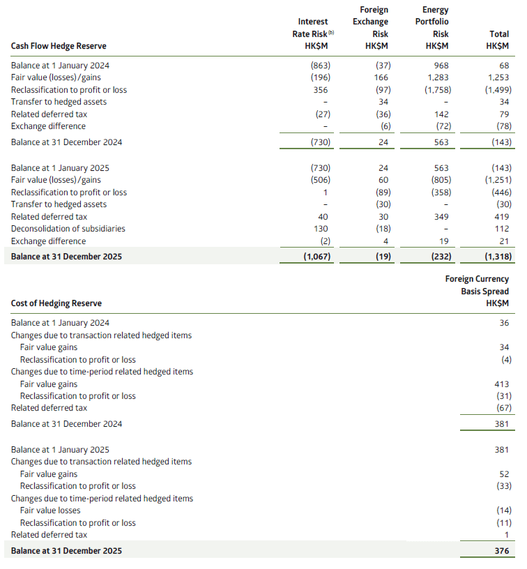 The Group closely monitors translation risk using a Value-at-Risk (VaR) approach but does not hedge foreign currency translation risk because translation gains or losses do not affect the project company’s cash flow or the Group’s annual profit until an investment is sold. At 31 December 2025, the Group’s net investment subject to translation exposure was HK$44,113 million (2024: HK$43,150 million), arising mainly from our investments on the Chinese Mainland, Australia, India, and Taiwan Region and Southeast Asia. This means that, for each 1% (2024: 1%) average foreign currency movement, our translation exposure will vary by about HK$441 million (2024: HK$432 million). All the translation exposures are recognised in other comprehensive income and therefore have no impact on the profit or loss.