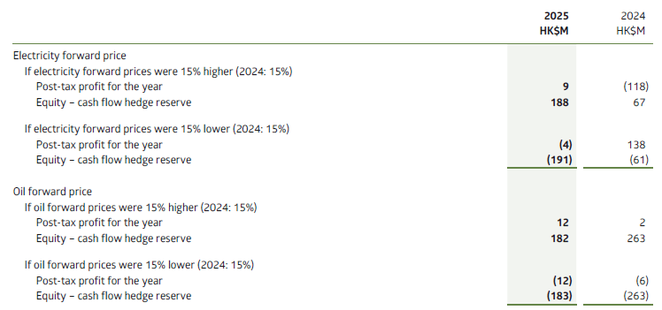 At the end of the reporting period, the extent of the impact to the Group’s post-tax profits and other comprehensive income due to the change of the observable energy forward market prices is as follows: