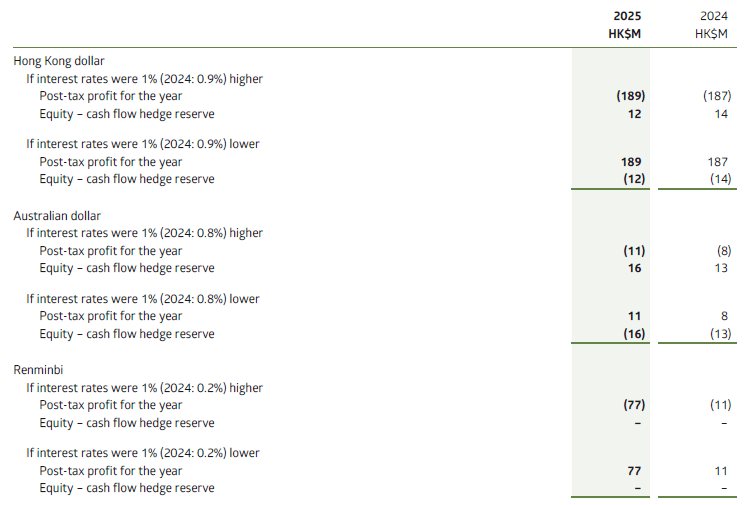 The sensitivity analysis below presents the effects on the Group’s post-tax profit for the year (as a result of change in interest expense on floating rate borrowings) and equity (as a result of change in the fair value of derivative instruments which qualify as cash flow hedges). Such amounts accumulated in equity are reclassified to profit or loss in the periods when the hedged items affect profit or loss, and offset one another in the profit or loss.