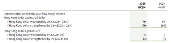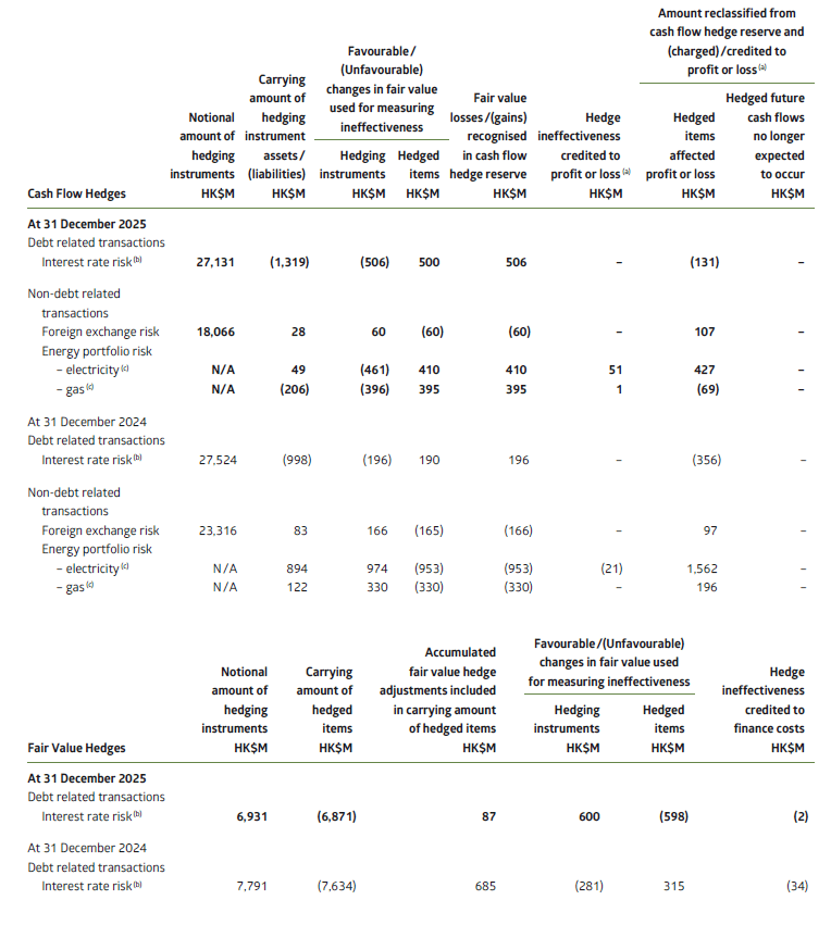 Under the SoC, the SoC Companies are allowed to pass-through foreign exchange gains and losses arising from future non-capital projects related commercial transactions and recognised liabilities which are denominated in a currency other than Hong Kong dollar, thus retaining no significant foreign exchange risk of such payments over the long term. The SoC Companies use forward contracts and currency swaps to hedge all their debt repayment obligations denominated in foreign currencies for the full tenor, and a significant portion of their US dollar obligations on fuel and nuclear power purchases, provided that for US dollar the hedging can be accomplished at rates below the Hong Kong Government’s historical target peg rate of HK$7.8 : US$1. The objective is to reduce the potential impact of foreign exchange movement on electricity tariffs. The SoC Companies also use forward contracts to manage the foreign exchange risks arising from non-Hong Kong dollar payment obligations for major capital projects, for which the exchange gains and losses are capitalised.