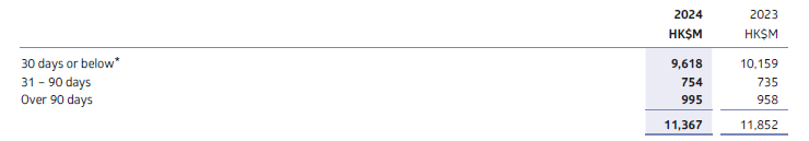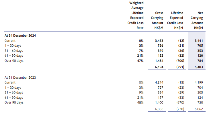 In Hong Kong, electricity bills are due within two weeks after issuance. To limit the credit risk exposure, the Group has a policy to require cash deposits or bank guarantees from customers for an amount determined from time to time by reference to the usage of the customers, and in the normal course of events will not exceed the highest expected charge for 60 days. For all the deposits held, customers are paid at a floating market interest rate equivalent to the HSBC bank saving rate. At 31 December 2024, such cash deposits amounted to HK$7,207 million (2023: HK$6,880 million) and the bank guarantees stood at HK$952 million (2023: HK$919 million). The customers’ deposits are treated on the statement of financial position as current liabilities on the basis that they are repayable on demand.