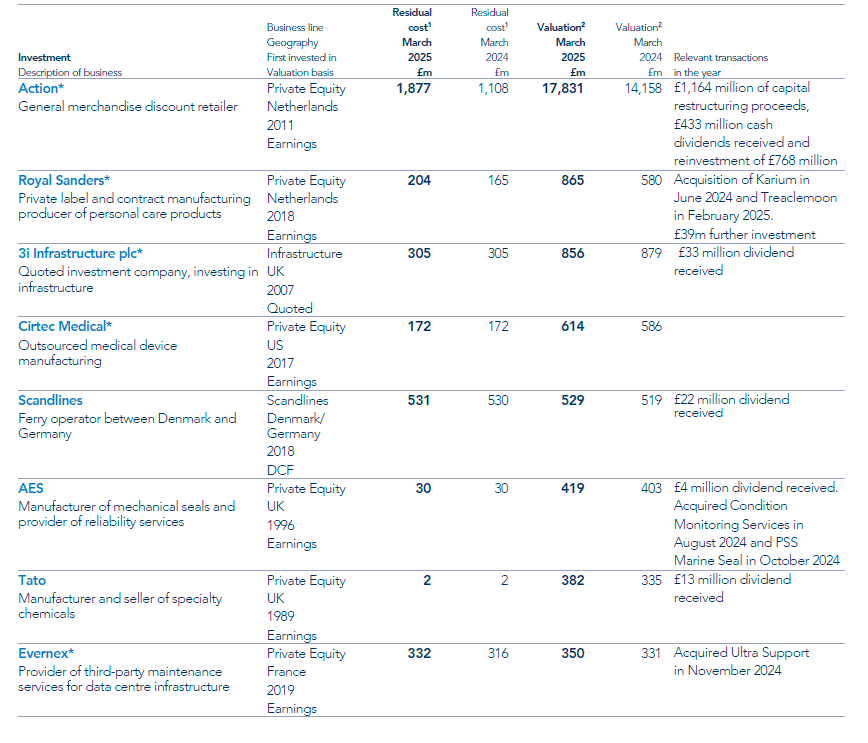 The 20 investments listed below account for 95% of the portfolio at 31 March 2025 (31 March 2024: 95%). One portfolio company has been excluded due to commercial sensitivity. All investments have been assessed to establish whether they classify as accounting subsidiaries under IFRS and/or subsidiaries under the UK Companies Act. This assessment forms the basis of our disclosure of accounting subsidiaries in the financial statements.