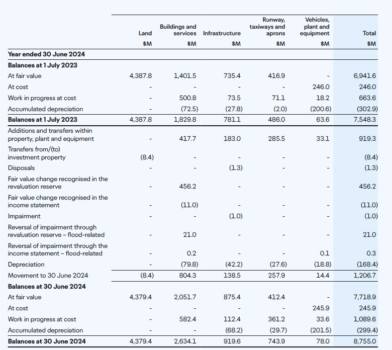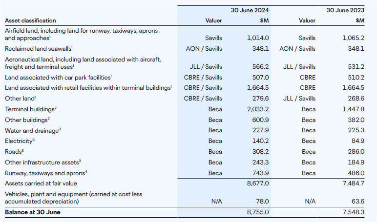 4 At 30 June 2024, the assessment is that there is no material change in the fair value of runways, taxiways and apron assets compared with carrying values. This class was last revalued at 30 June 2023.