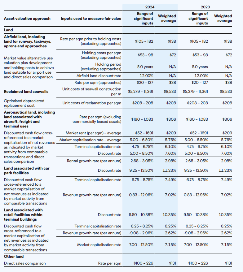 The assessment on land, to determine whether a revaluation was likely to be required at 30 June 2024, was supported by management’s review of fair value changes for comparable land within the investment property portfolio. The assessment on infrastructure and runway assets was supported by management’s review of movements in relevant subcategories of the capital goods price index. The valuation approach is the optimised depreciated replacement cost. Movements in the relevant capital goods price index subcategories provide a strong indication of movements in the cost of replacing these assets as at 30 June 2024.