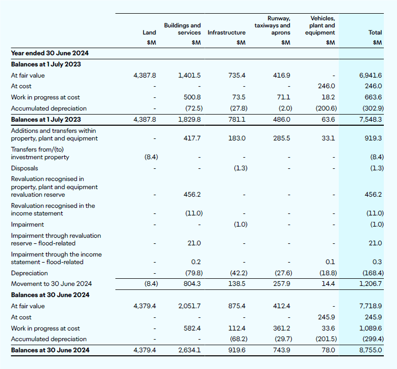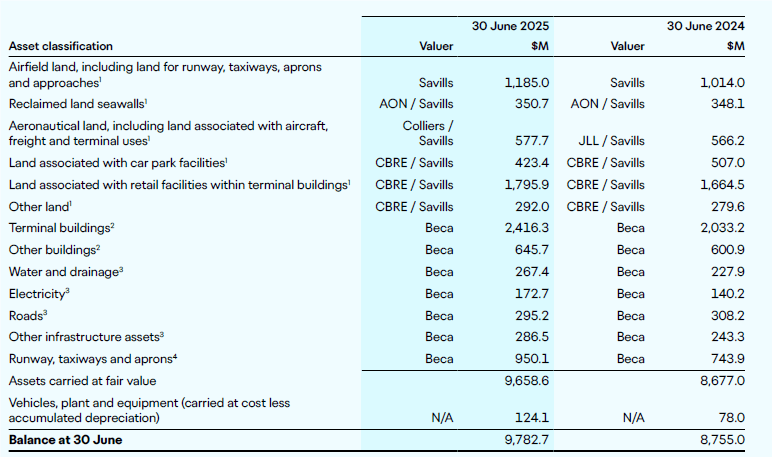 4 At 30 June 2025, the assessment is there is no material change in the fair value of runways, taxiways and apron assets compared with carrying values. This class was last revalued at 30 June 2023.