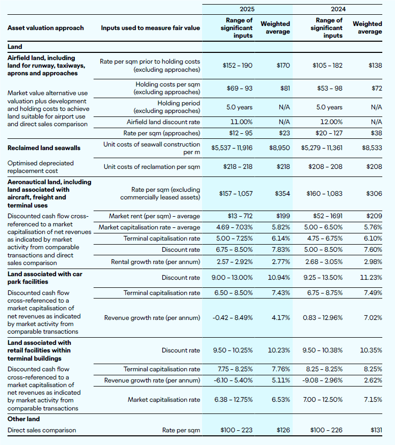 The valuation inputs for land are from the 2025 valuation, while the prior year’s comparatives are from the 2023 valuation of these assets. The valuation inputs for buildings and services are unchanged from the 2024 valuation. The valuation inputs for infrastructure and runways, taxiways and aprons are unchanged from the 2023 valuation. These asset classes were not revalued in 2025 because the carrying value was not assessed to be materially different from fair value.