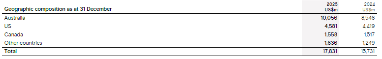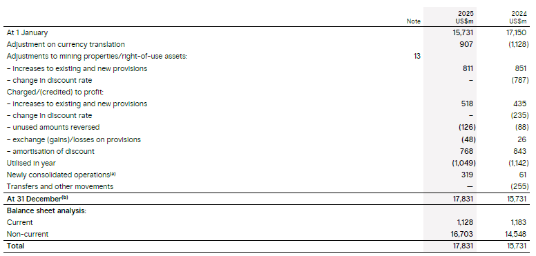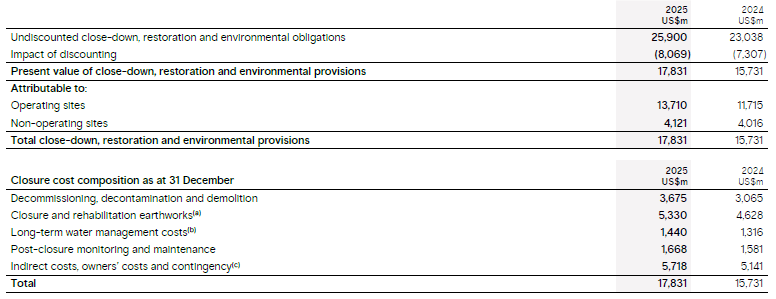 (b) Close-down, restoration and environmental provisions at 31 December 2025 have not been adjusted for closure-related receivables amounting to US$394 million (2024: US$350 million) due from the ERA trust fund and other financial assets held for the purposes of meeting closure obligations. These are included within “Receivables and other assets” on the balance sheet.