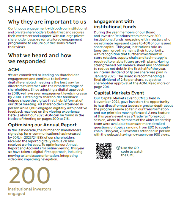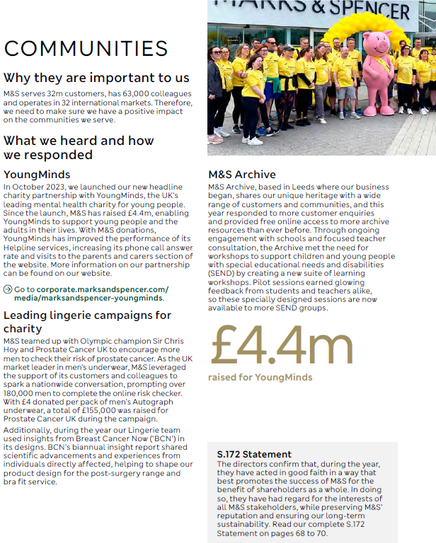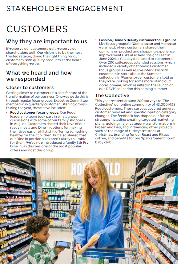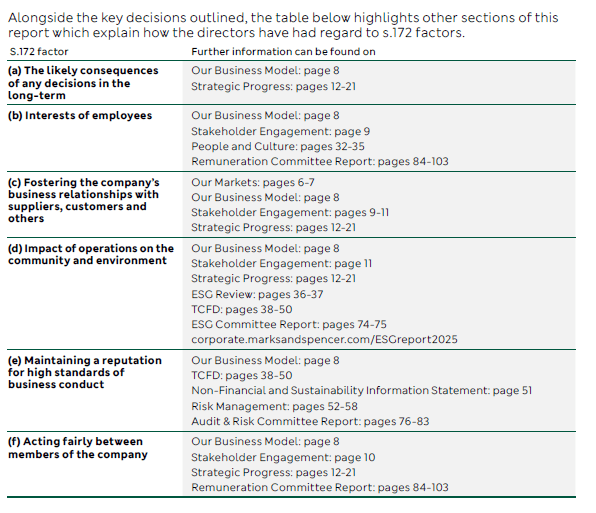 Section 172 statement and details of stakeholder engagement Marks and Spencer Group plc – Annual report – 29 March 2025 Industry: retail Pages 68-70 Share this: Click to share on X (Opens in new window) X Click to share on Facebook (Opens in new window) Facebook Like Loading...