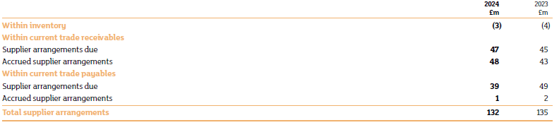 Income from supplier arrangements is recognised when earned by the Group when all obligations per the terms of the contract have been satisfied. Any supplier arrangements which are linked to inventory purchases are included within the cost of the related inventory, and therefore recognised within cost of sales once the inventory is sold. Unpaid amounts relating to supplier arrangements are recognised within trade and other receivables, unless there is a legal right of offset, in which case it is recognised within trade and other payables. Amounts which have been invoiced at the balance sheet date are categorised as supplier arrangements due and those not yet invoiced are categorised as accrued supplier arrangements.