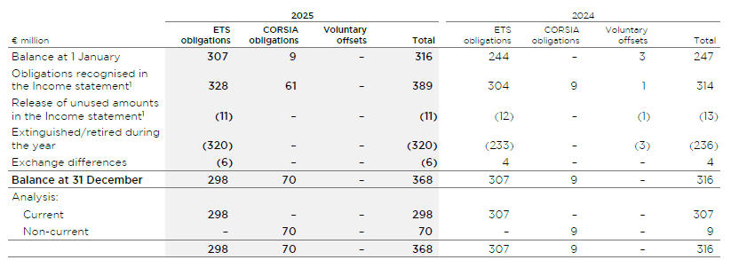1 For the year to 31 December 2025, the total amount in the Income statement within Fuel costs and emission charges that related to emission allowances was €378 million (2024: €301 million). Refer to note 6.