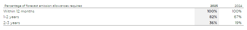 At 31 December 2025 and 31 December 2024, the Group had acquired and committed to acquire, at fixed prices, the following percentages of its total emissions allowances forecast to be purchased over the three-year business plan periods: